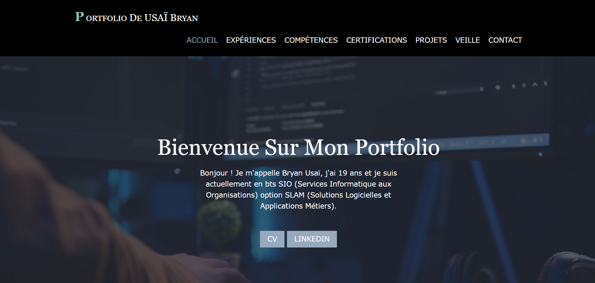 Bonjour ! Je m'appelle Bryan Usaï, j'ai 19 ans et je suis actuellement en bts SIO (Services Informatique aux Organisations) option SLAM (Solutions Logicielles et Applications Métiers).